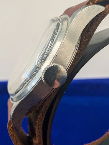 Bracelet/Strap: Fitted with a brown leather military-style strap (replacement), designed to complement the watch’s utilitarian character. Originally issued with NATO-style webbing straps compatible with fixed lugs.
